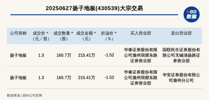 每经讯,2025年6月27日,新三板创新层公司扬子地板(430539,收盘价:1.32元)发生2笔大宗交易,总成交金额为430.82万元,成交金额最高的一笔成交价1.3元/股,成交数量165.7万股,成交金额215.41万元,折价1.52%。买入营业部是华泰证券股份有限公司滁州琅琊东路证券营业部,卖出营业部是国联民生证券股份有限公司无锡清扬路证券营业部。